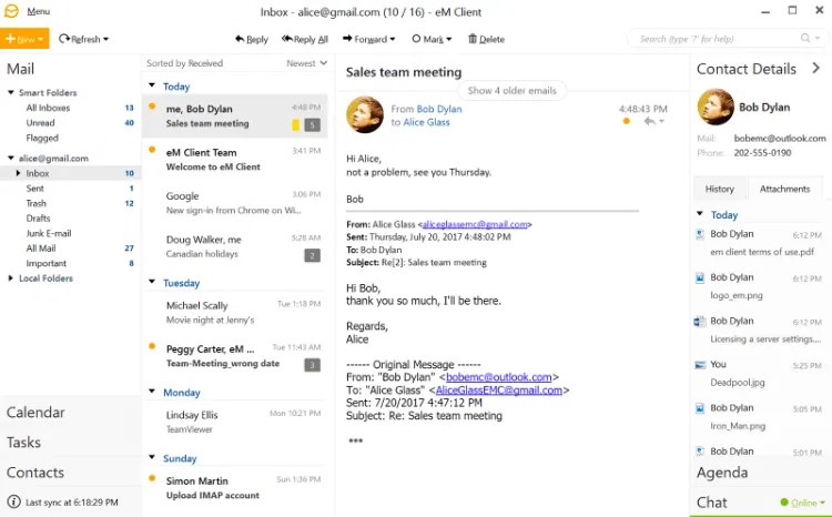 Что касается встроенных инструментов, то eM Client наверняка предложит полезные для вас возможности: проверка правописания, перевод на другие языки с помощью переводчика Bing, простой обмен событиями календаря и задачами с другими пользователями, гибкая настройка списка контактов для лучшей организации при использовании нескольких почтовых профилей. Встроенный живой чат даже позволяет быстро обмениваться файлами.