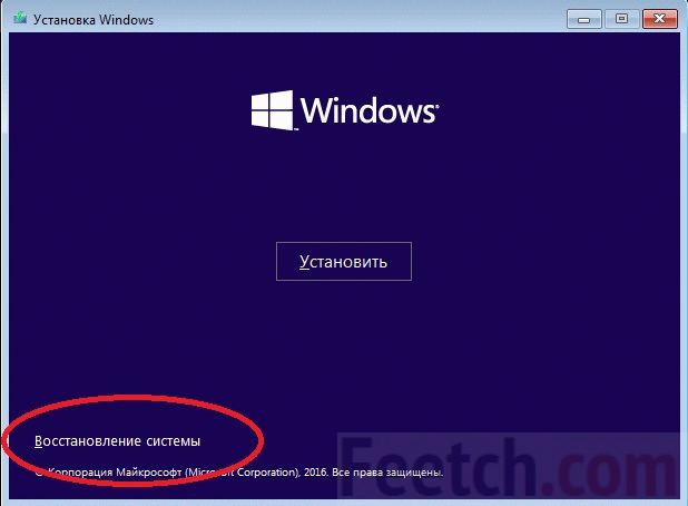 Имеется ещё один вариант, когда система не грузится вовсе. Делаем все так же, как описано выше, до появления окна с кнопкой Установить. Именно здесь имеется в нижнем левом углу надпись Восстановление системы. Сюда и нужно кликнуть мышкой.